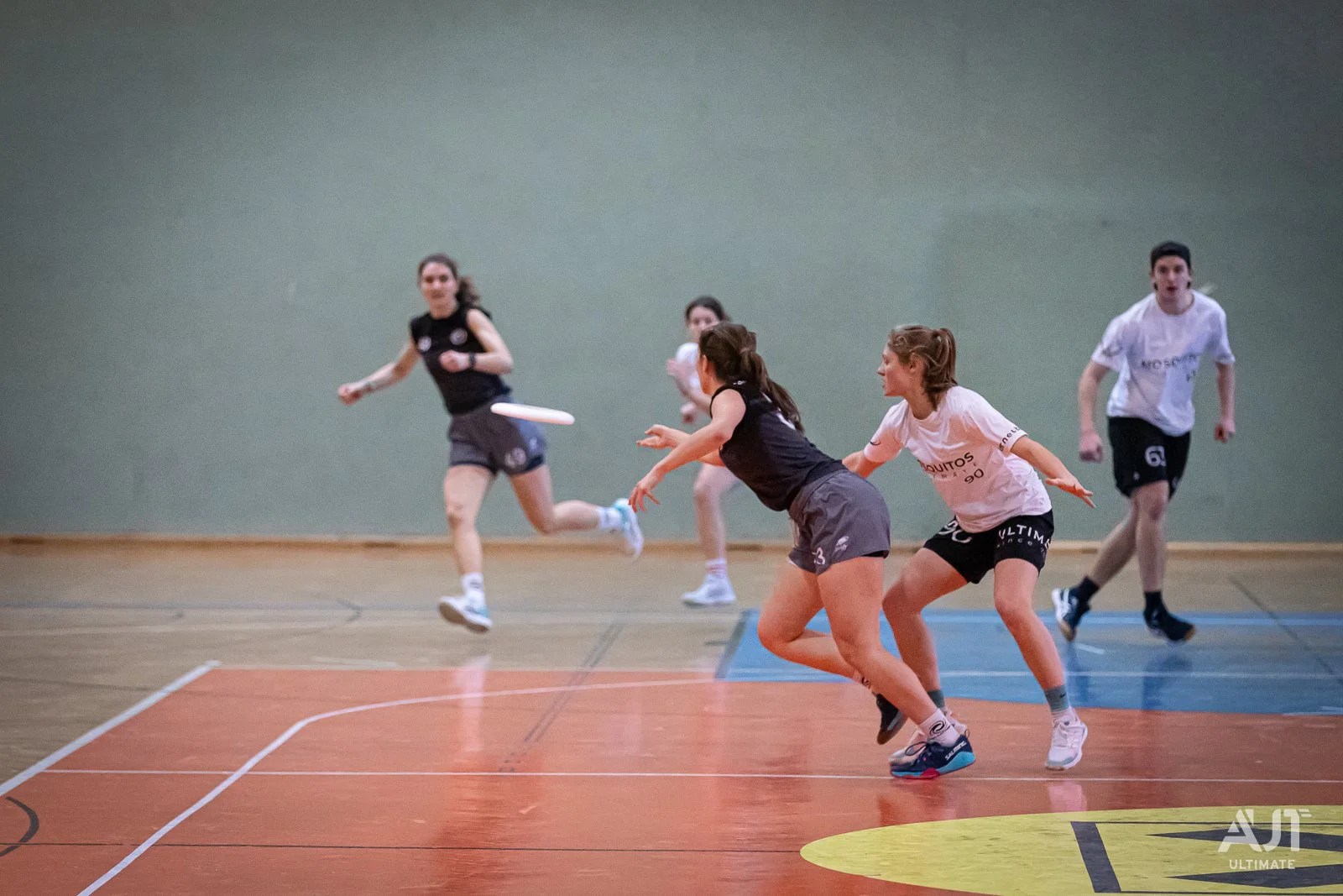 Indoor Ultimate wird in der Regel im Format 5 gegen 5 in der Halle gespielt. Das Spielfeld ist kleiner als am Rasen, und die Abwesenheit von Wind ermöglicht ein risikofreudigeres Spiel.